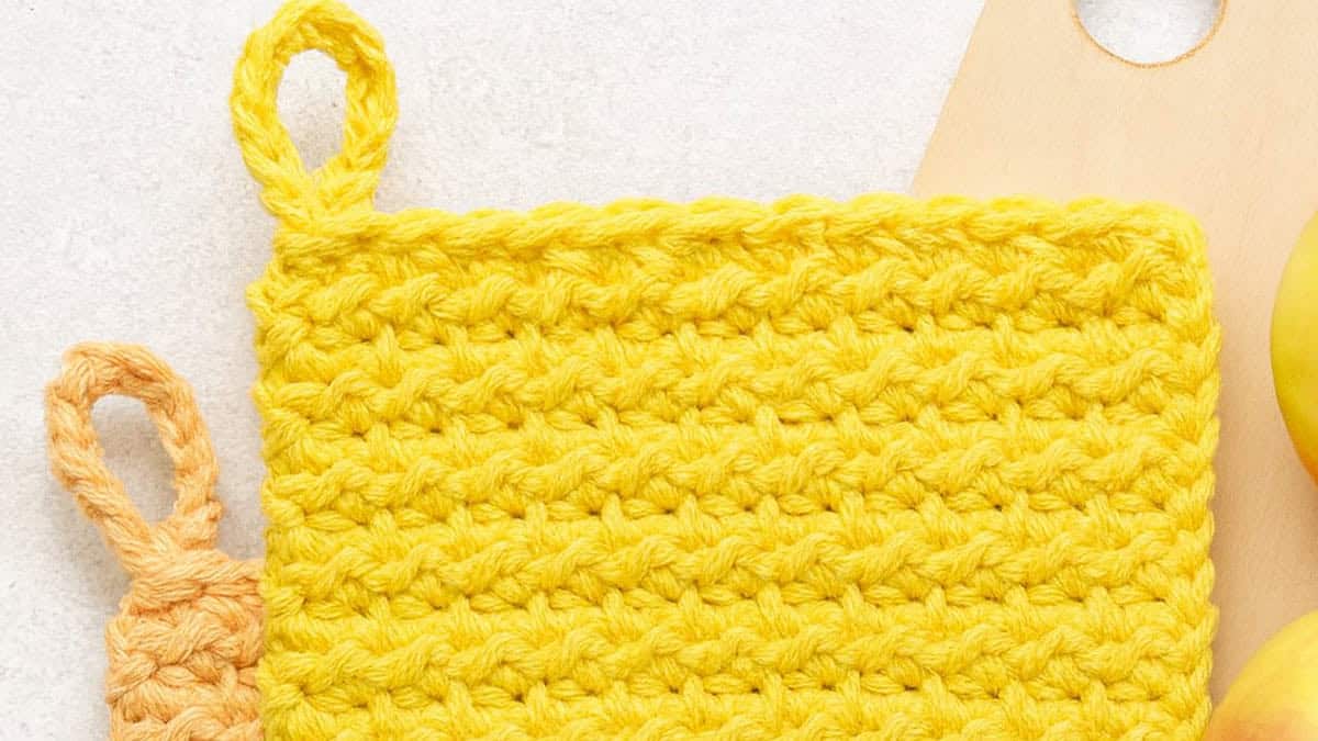 To make this crochet potholder, you’ll need worsted weight cotton yarn, a 5 mm (H) hook, scissors, and a yarn needle. Start by chaining an even number of stitches to reach your desired width.